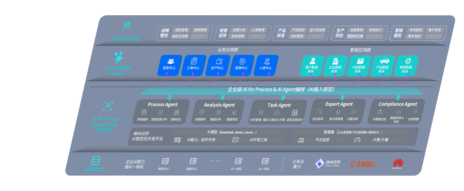 端到端的一站式AI工作空间深度融合了从企业战略规划到日常经营的全流程业务板块,,,定向解决车企内部领域多、、部门多、、链条长、、、、场景碎片化等难题,,支持车企快速构建以AI为核心的生产力写作体系,,,实现任务执行与AI能力的无缝集成与交互