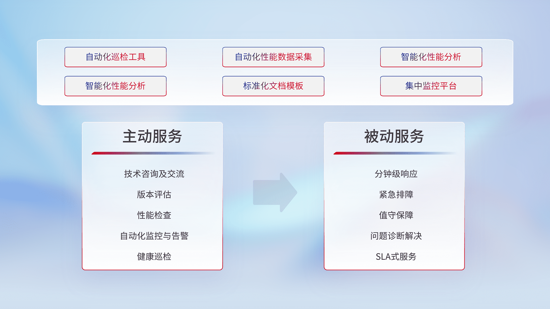 智能化工具和标准化文档,,保障服务质量,,提供主动服务(包含技术咨询、、、、版本评估、、、性能检查、、、自动化监控与告警、、、、健康巡检)和被动服务包含(分钟级响应、、、紧急排障、、、值守保障、、、问题诊断解决、、、、SLA服务)。。
