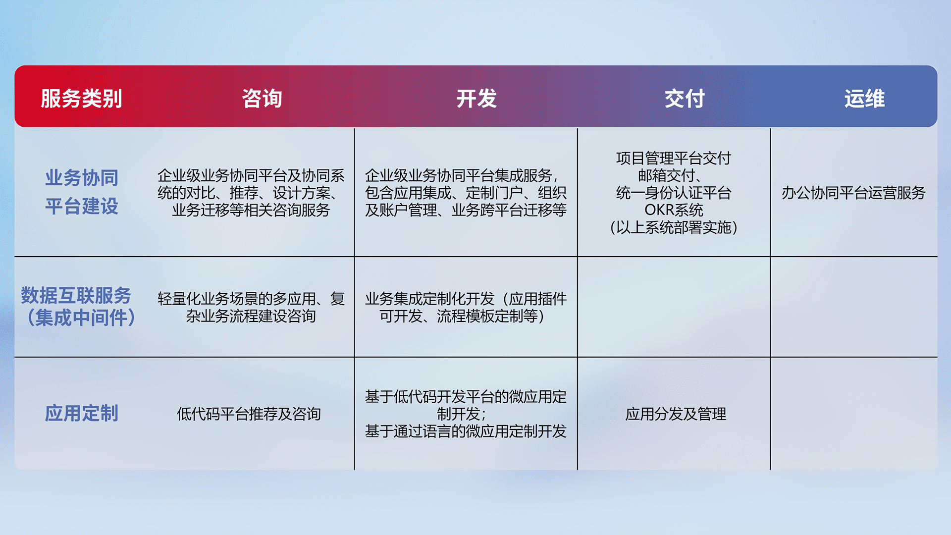 针对钉钉、、、、企微、、IDaas等平台级产品提供产品的规划、、、、方案、、、交付、、定制化开发等服务,,,,实现如统一协同办公、、智能客户服务、、、、混合会议管理、、智能数据查询、、、、等业务场景,,,,实现数字化转型。。。。